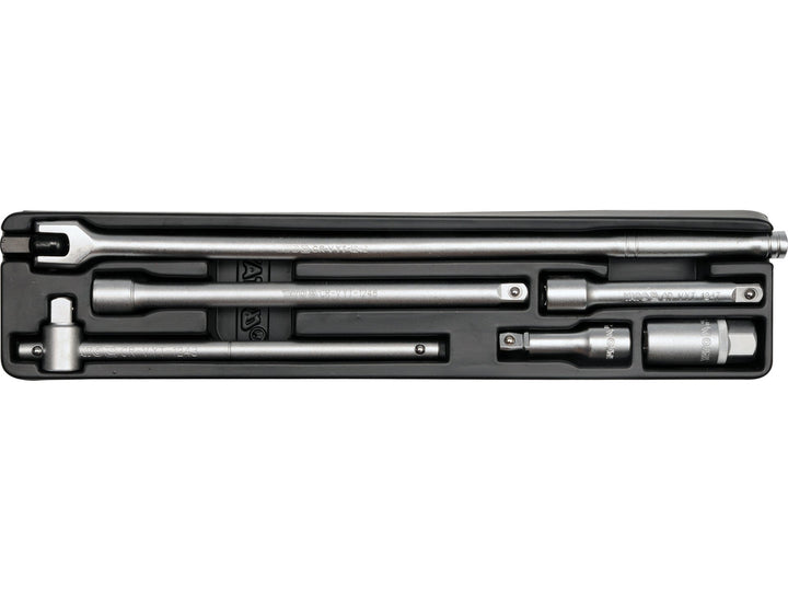 Extensions: 1/2" drive extension bars (commonly around 76 mm, 127 mm and 254 mm lengths).